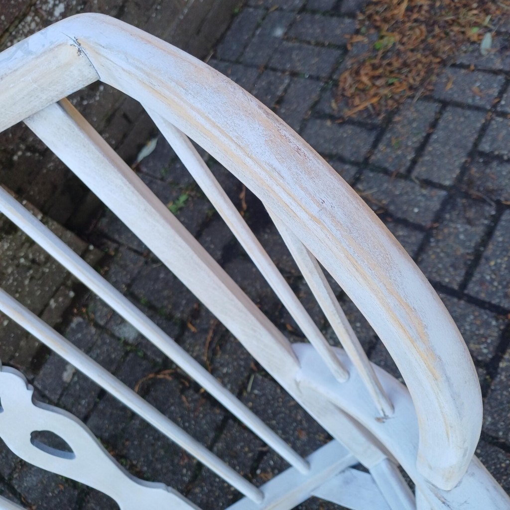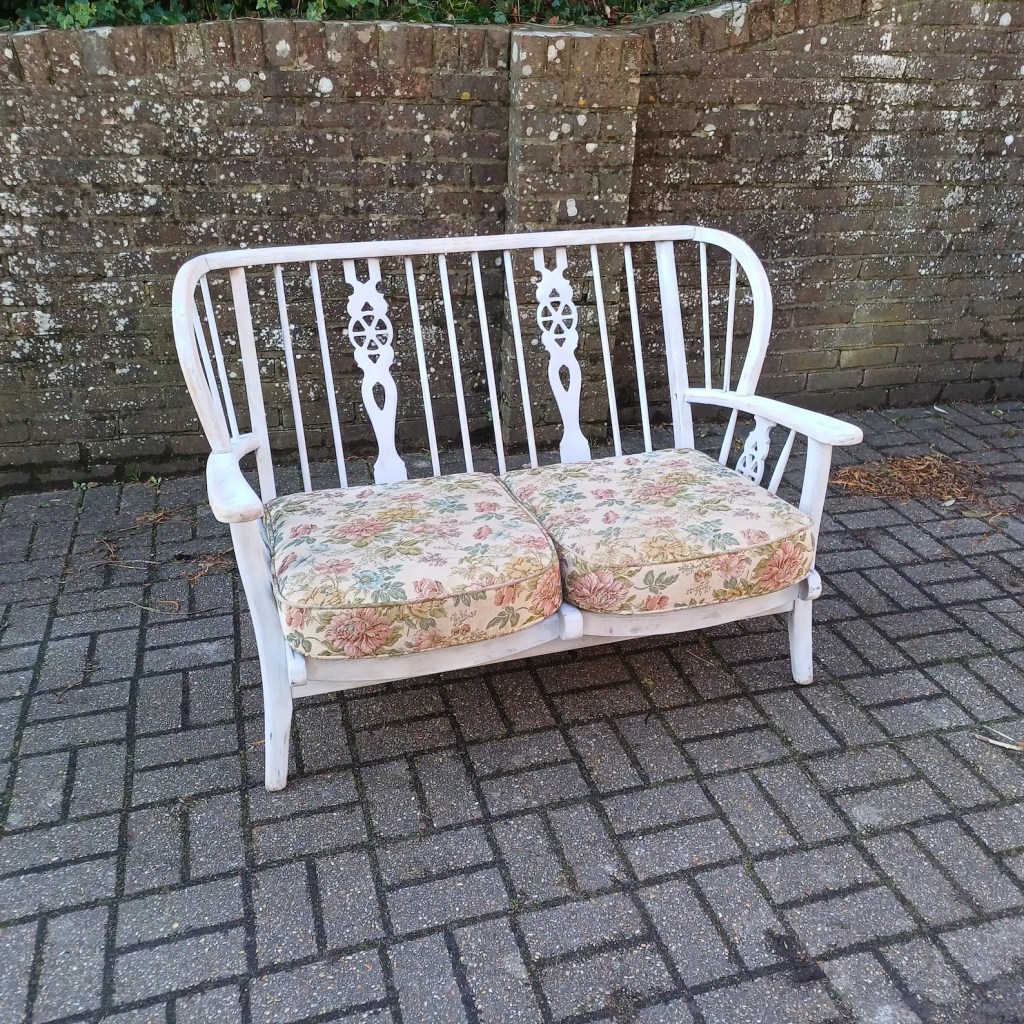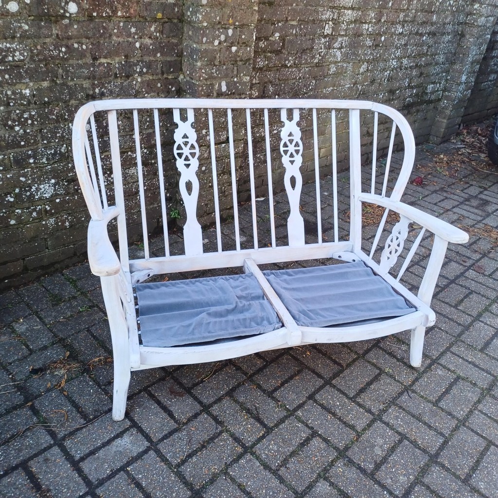 The frame has been painted in a gorgeous medium-grey chalk paint, then lightly sanded to reveal hints of the original wood. The result? A perfectly imperfect distressed look that adds character without appearing too rustic. The upcycler made a bold choice—no extra cushions—letting the beautiful wheel-back design take centre stage. And guess what? It works! Surprisingly comfortable as is, but if you prefer extra padding, a few stylish cushions will do the trick. Use your imagination, not an Argos catalogue of crap.