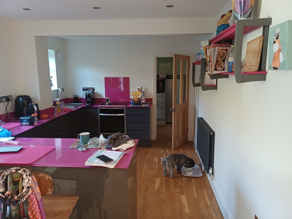 One such item was a lovely G Plan coffee table. A beautiful thing with real character, but sadly it rocked like a boat in a storm and the top had long since lost its charm and been well and truly compromised. If restored properly it might have been worth around £140, but three or four hours of work would have gone into it, and realistically that just wasn’t a wise use of time. Even so, I couldn’t bring myself to throw it. It was a lovely old table with history, and after forty years in the trade you develop a loyalty to these pieces. Destroying a piece of furniture, even a battered one, feels almost sacrilegious. It deserved better than ending up in a skip. Then, four years ago, we moved into a smart house near Lewes with a retro, slightly garish pink and grey kitchen. One wall was completely bare, and suddenly the solution presented itself.