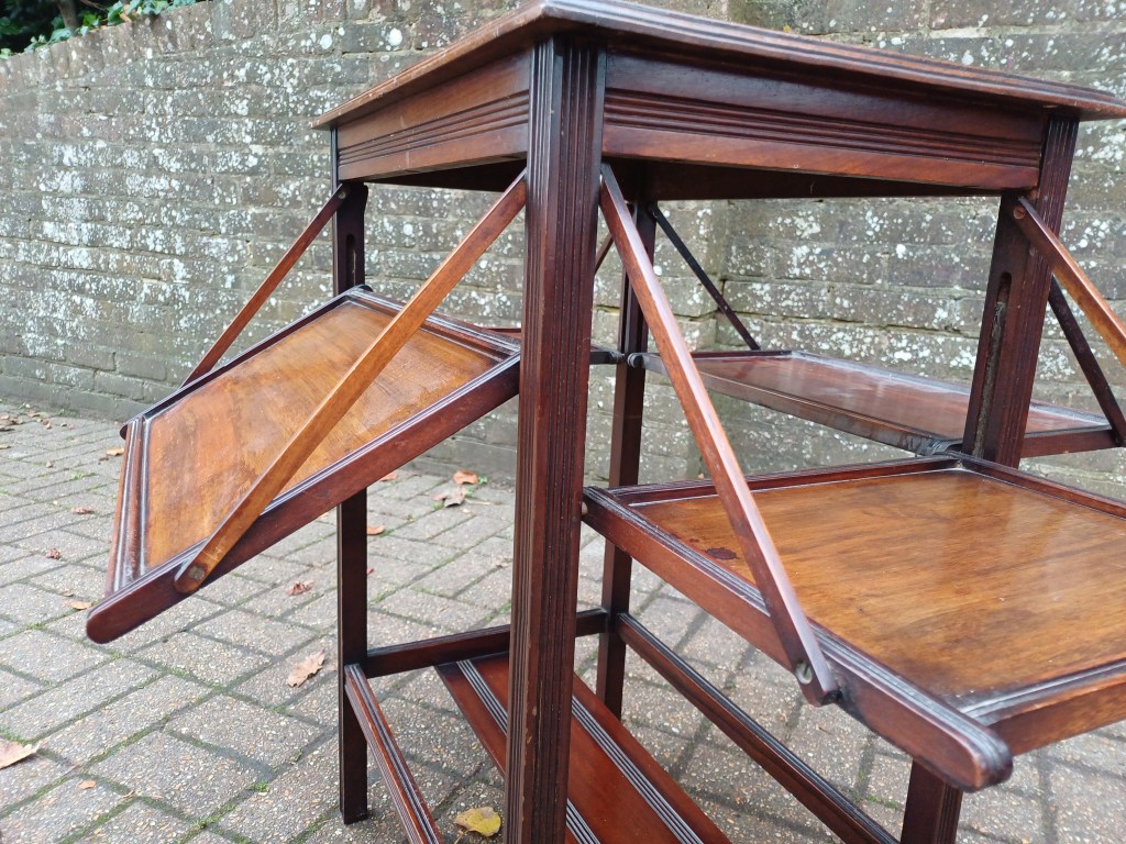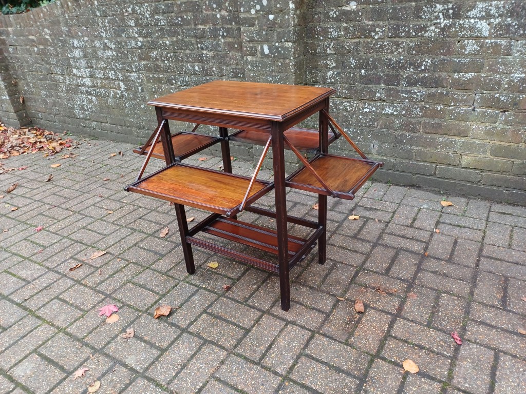 The table features a beautifully finished top with soft moulded edges and four swing out trays arranged on two tiers, each tray opening smoothly on its amazing delicate original timber supports to create an instantly expanded serving area, ideal for placing drinks, afternoon tea, decanters, books, or small collections that deserve to be displayed with ceremony. When closed, the piece sits as a neat, compact table suitable for a hallway, sitting room, study or landing, but when opened it transforms into a wonderfully sociable multi-shelf presentation surface that feels at home in interiors inspired by Arts & Crafts, Edwardian domesticity or refined country-house tradition.