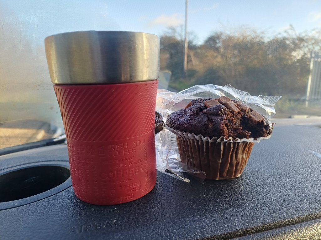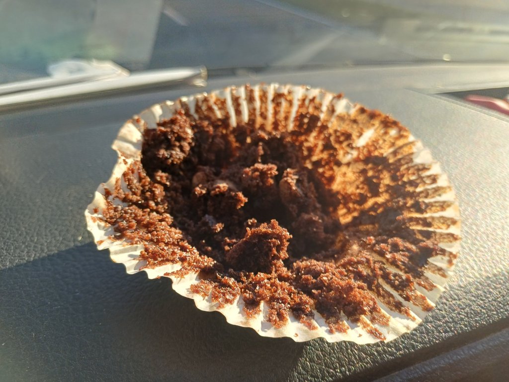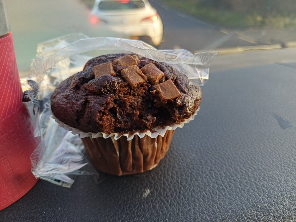 Over time, I’ve perfected a method of eating this muffin without redecorating the interior of the vehicle. It’s a ritual now. First, you nibble away at the exterior of the top, carefully, patiently, paring it back like an archaeologist working towards something important. Then, once the structural perimeter has been reduced, you save the centre. This is where the highest concentration of Belgian chocolate lives. This is the crème de la crème.